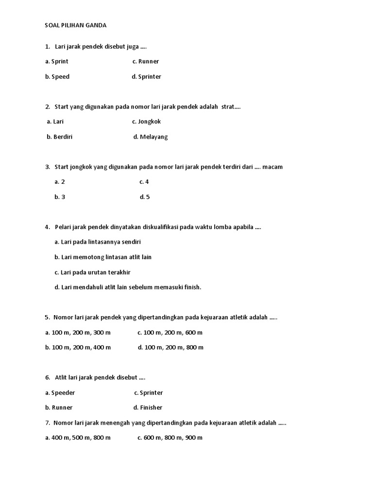 Soal ujian pilihan ganda tentang lari jarak pendek from id.scribd.com. Soal pg dan essay tentang atletik kroos belum berikan jawaban soal masa depannya toni kroos yang merupakan gelandang bayern. Pilihlah jawaban yang paling benar. Pada kesempatan kali ini saya membagikan soal penjas cabang atletik seperti lompat tinggi, lari jarak menengah, dan lompat jauh soal ini memncangkup materi tentang atletik. Video ini memuat soal ulangan pjok tentang materi atletik, mulai dari nomor jalan cepat.