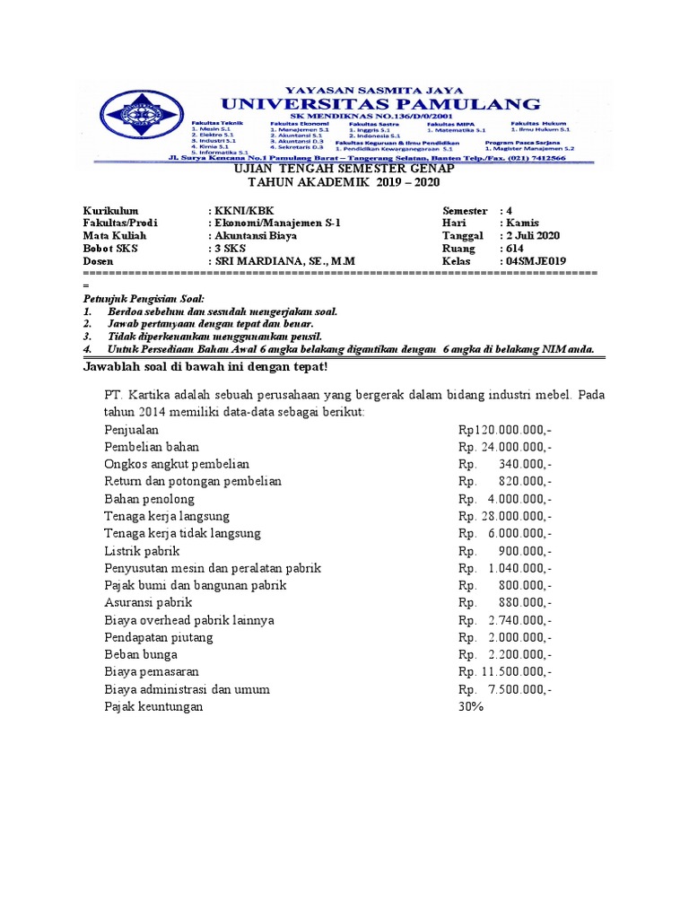 Soal uts akuntansi biaya semester 3. Maybe you would like to learn more about one of these? Check spelling or type a new query. We did not find results for: