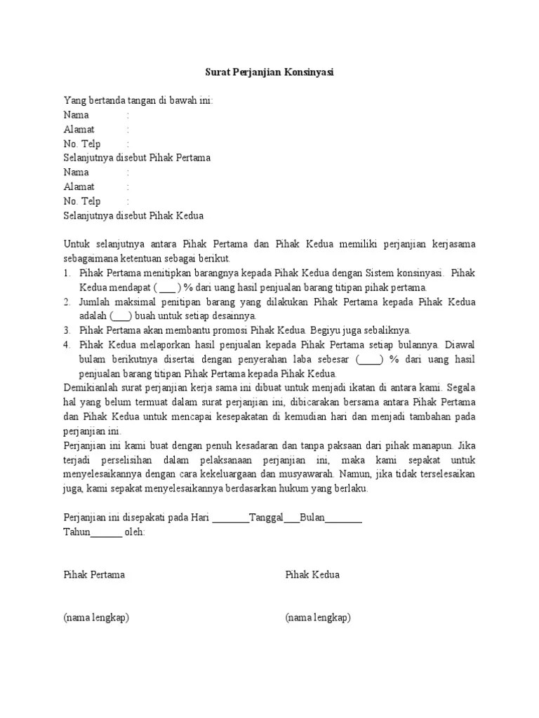 surat perjanjian konsinyasi (titip jual) konsinyasi merupakan salah cara memulai usaha tanpa modal. Contoh surat perjanjian jual beli mobil dan truk bekas maupun baru berita logistik dan transportasi indonesia. Dalam kegiatan bisnis, terkadang diperhadapkan pada perbuatan hukum perjanjian titip jual (konsinyasi).oleh karena itu, pada kesempatan kali ini kami akan memberikan contoh surat tentang surat perjanjian titip jual (konsinyasi) yang mungkin nantinya sangat anda butuhkan sebelum mengadakan pengikatan ataupun penandatanganan surat perjanjian titip jual (konsinyasi) dimaksud. Kami berharap semoga ulasan contoh surat perjanjian konsinyasi barang dapat memberikan gambaran secara utuh kepada anda mengenai contoh surat perjanjian konsinyasi barang serta aneka peluang bisnis. Contoh surat perjanjian kerjasama diperlukan untuk anda yang ingin membuat surat perjanjian bisnis. Oleh pakdosen diposting pada 7 juli 2021. 15 contoh surat perjanjian kerjasama berbagai bidang contoh surat. Ketika membuat sebuah perjanjian dengan pihak lain, sebagaimana telah dibahas sebelumnya, harus dipastikan perjanjian tersebut telah sah secara hukum (baca kembali : Contoh surat perjanjian kerjasama konsinyasi surat perjanjian kerjasama konsinyasi perjanjian kerjasama konsinyasi ini dibuat pada. surat perjanjian ini dibuat sebagai bentuk dalam membuat sebuah usaha sepatu antara pihak pertama dengan pihak kedua yang menjadi supplier sebagai penyedia bahan dasi. Jelaskan isi perjanjian dalam penjualan konsinyasi. surat perjanjian kerjasama tidak boleh dibuat asal, karena akan menjadi pedoman dalam menjalankan sesuatu hal kerjasama. 3 contoh surat perjanjian kerjasama yang sah sesuai hukum.